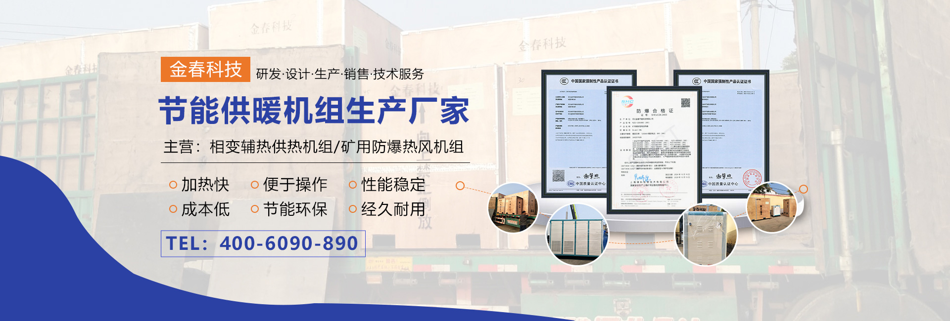 本公司專業(yè)生產(chǎn)相變輔熱供熱機組、礦用防爆熱風(fēng)機組,可代替燃煤、燃油、燃氣鍋爐,運行成本低,具有加熱快、熱效率高、便于操作,節(jié)能環(huán)保等特點,是新一代理想的環(huán)保節(jié)能產(chǎn)品。